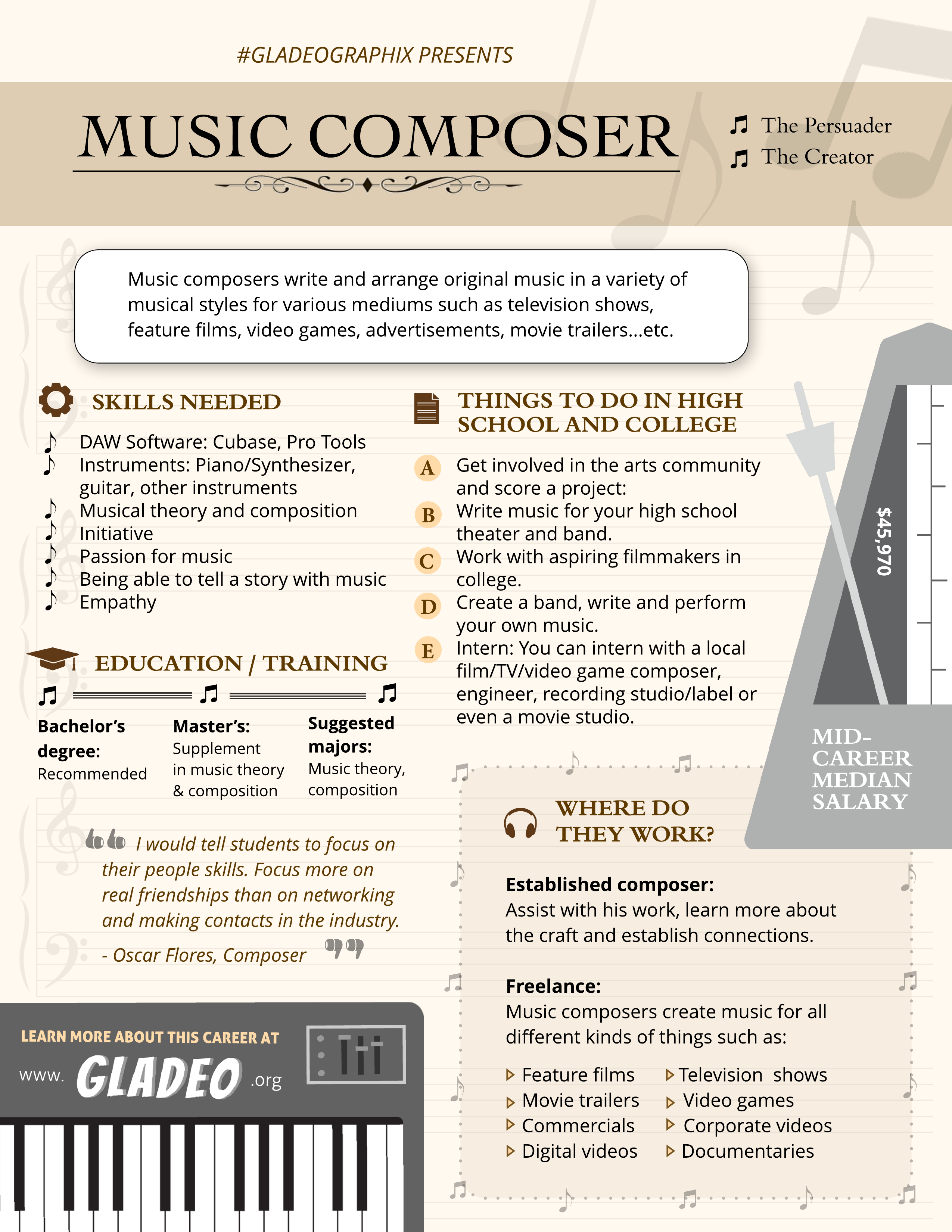 - Interview working Music Composers or watch video interviews to gain insights into the career field