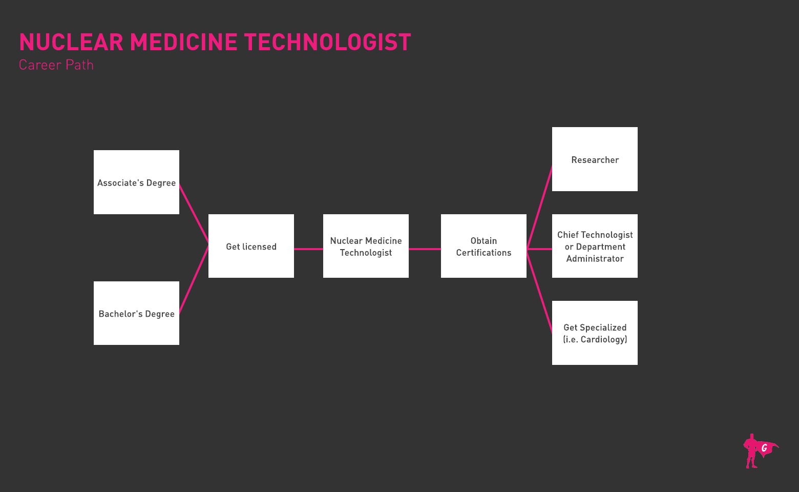 - Advanced roles may include Lead Nuclear Medicine Technologist, Radiation Safety Officer, and Senior Nuclear Medicine Technologist